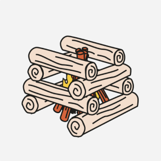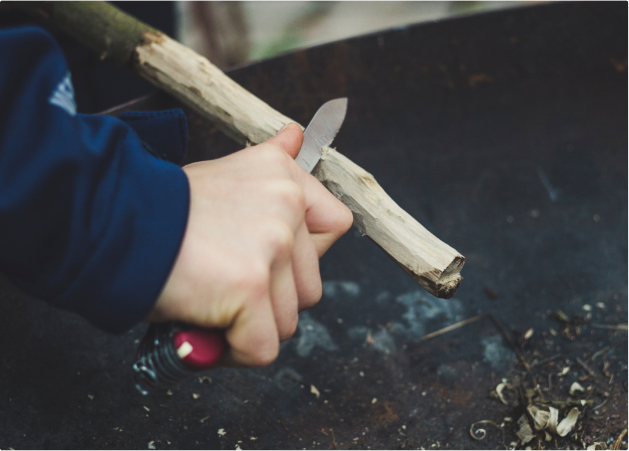 1. Recoja/talle yesca, o saque sus cubos para encender el fuego y astillas (palos de 6”). Construya una estructura tipi con sus astillas apoyadas sobre un gran paquete de yesca como base.